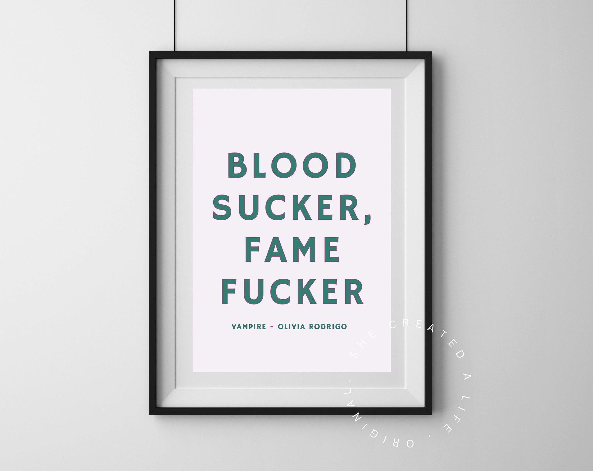 Blood Sucker, Fame Fucker. Vampire by Olivia Rodrigo song lyrics in beautiful pale pink with green typography. An image that will make you smile everyday, something you'd be proud to hang on your walls.