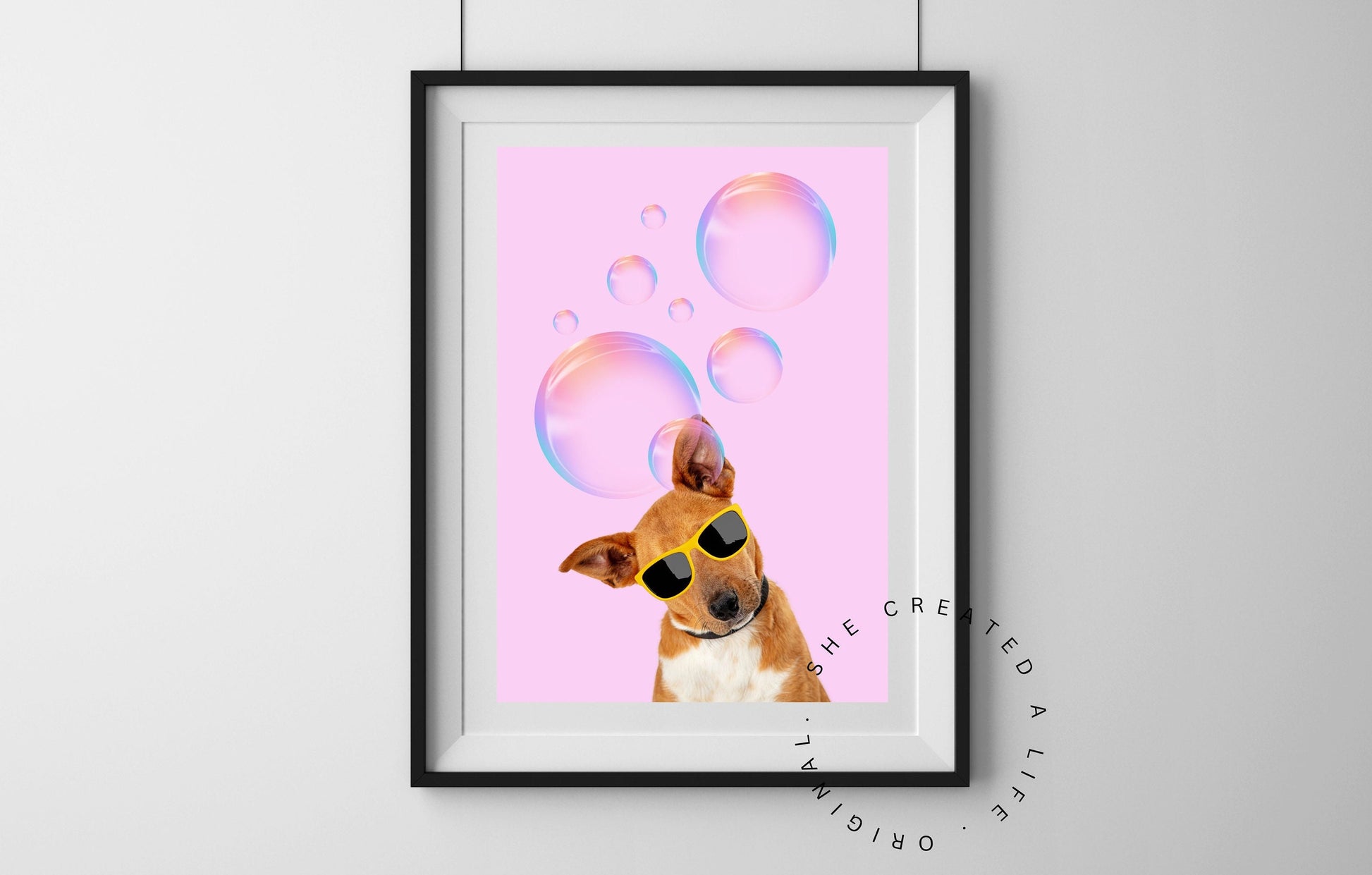 Quirky Puppy Dog Pink Wall Art Print. Pup in spectacles, funky pet portrait add some fun to your walls. Great as a gift for a new home or in a kids room. The pink colour and bubbles make it a fun addition to any wall.