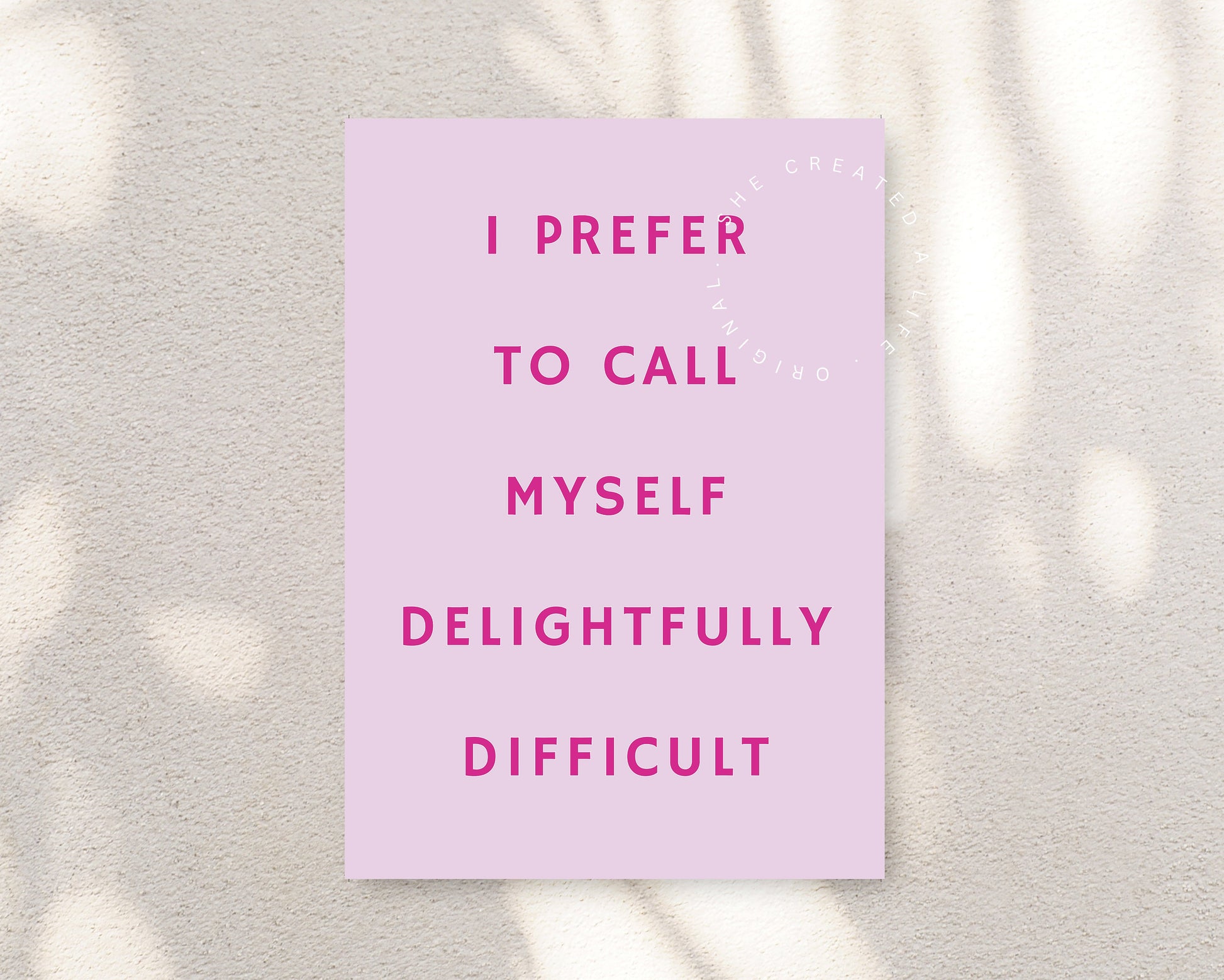 I Prefer To Call Myself Delightfully Difficult in beautiful pink typography. An image that will make you smile everyday, if you like to express yourself this print is for you.