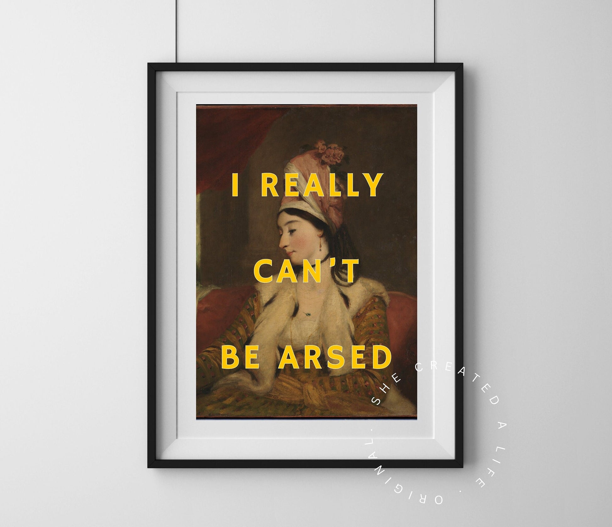 I Really Can't Be Arsed, Classic Altered Art Print with a touch of modern day vibes. This portrait is witty, colourful and humorous, bringing cheeky pleasure to the viewer. Liven up your life and your walls with this pleasing poster.