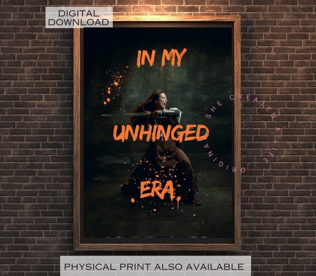 In My Unhinged Era, Because we all have our moments, Right? 😉 stunning orange graffiti style paint typography on a classic portrait of a strong woman wielding a sword.