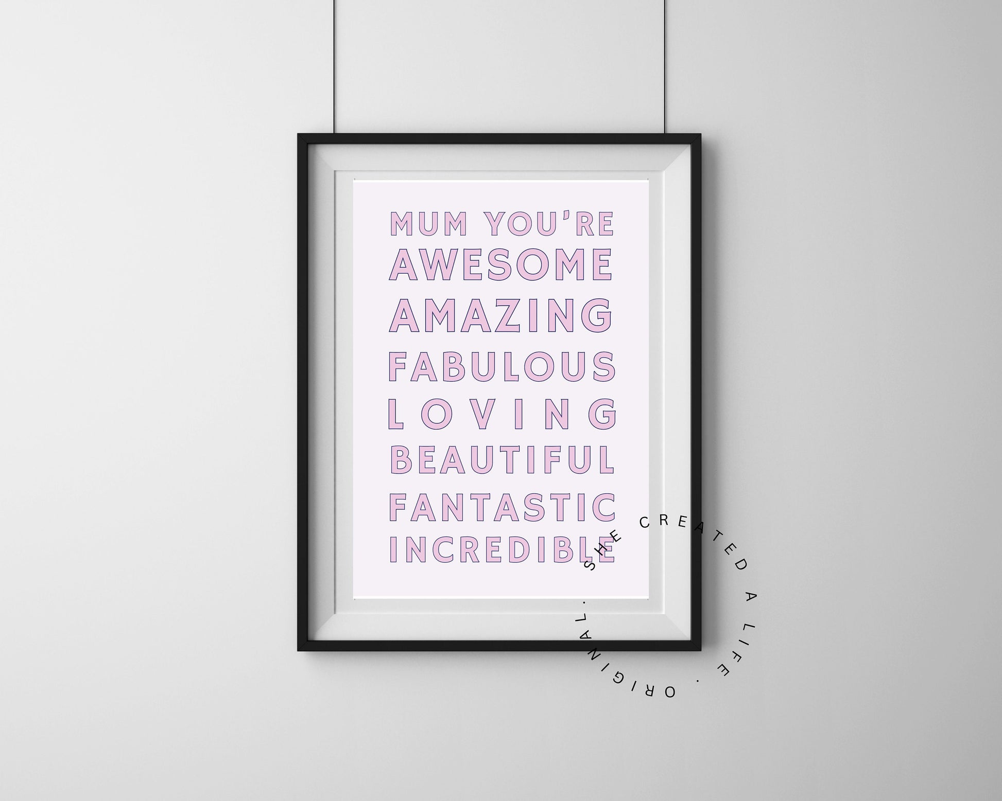 Mum You're Awesome, in beautiful pink typography. A gift for your Mum, to tell her how much you love her, how important she is to you. An image that will make her smile everyday, and be proud to hang on her wall.