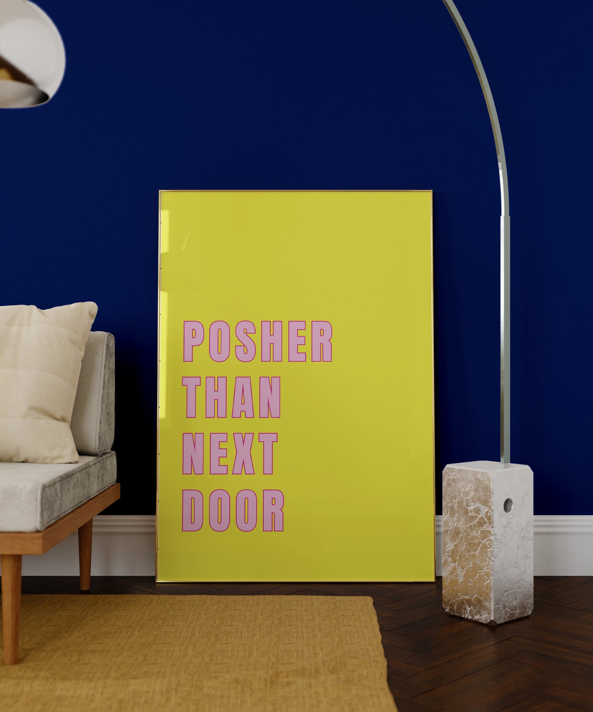 Posher Than Next Door, A quirky, fun, dramatic statement, bright bold style typography on a wonderful yellow background. Great humorous piece for a new home or house warming gift.