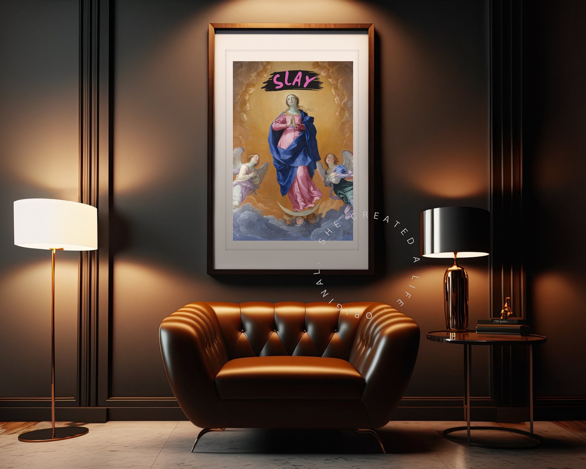 Slay, Girly Art, Female Print, Angels, Divine Feminine Poster, Altered Art Portrait, Feminist Words, Witty Phrase, Humorous, Eclectic Decor