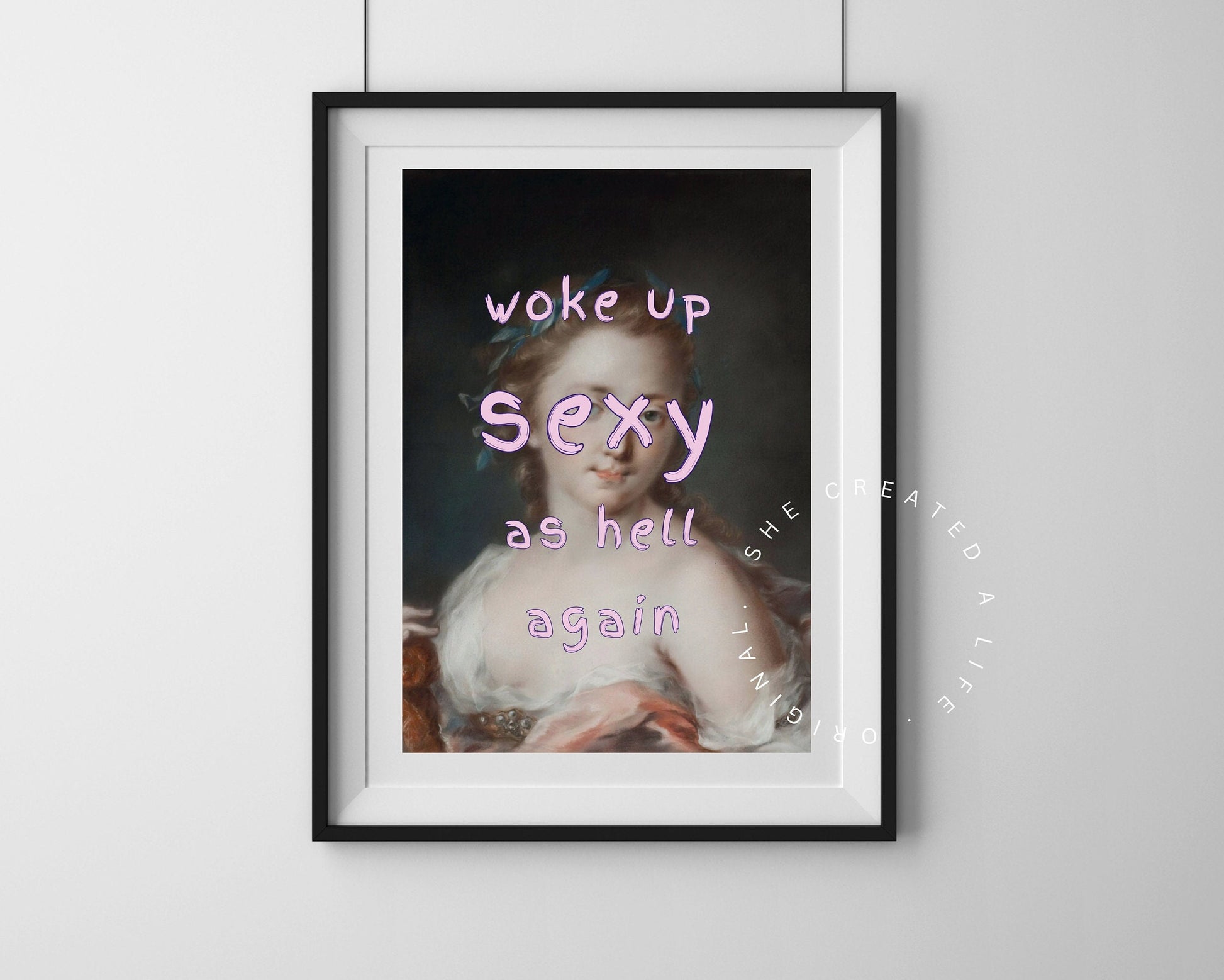Woke Up Sexy As hell Again. Funny altered art portrait with addition of possibly sarcastic comment in beautiful pink typography. An image that would be a great morning greeting in a bathroom or bedroom. An image to make you smile everyday, something you'd be proud to hang on your walls.