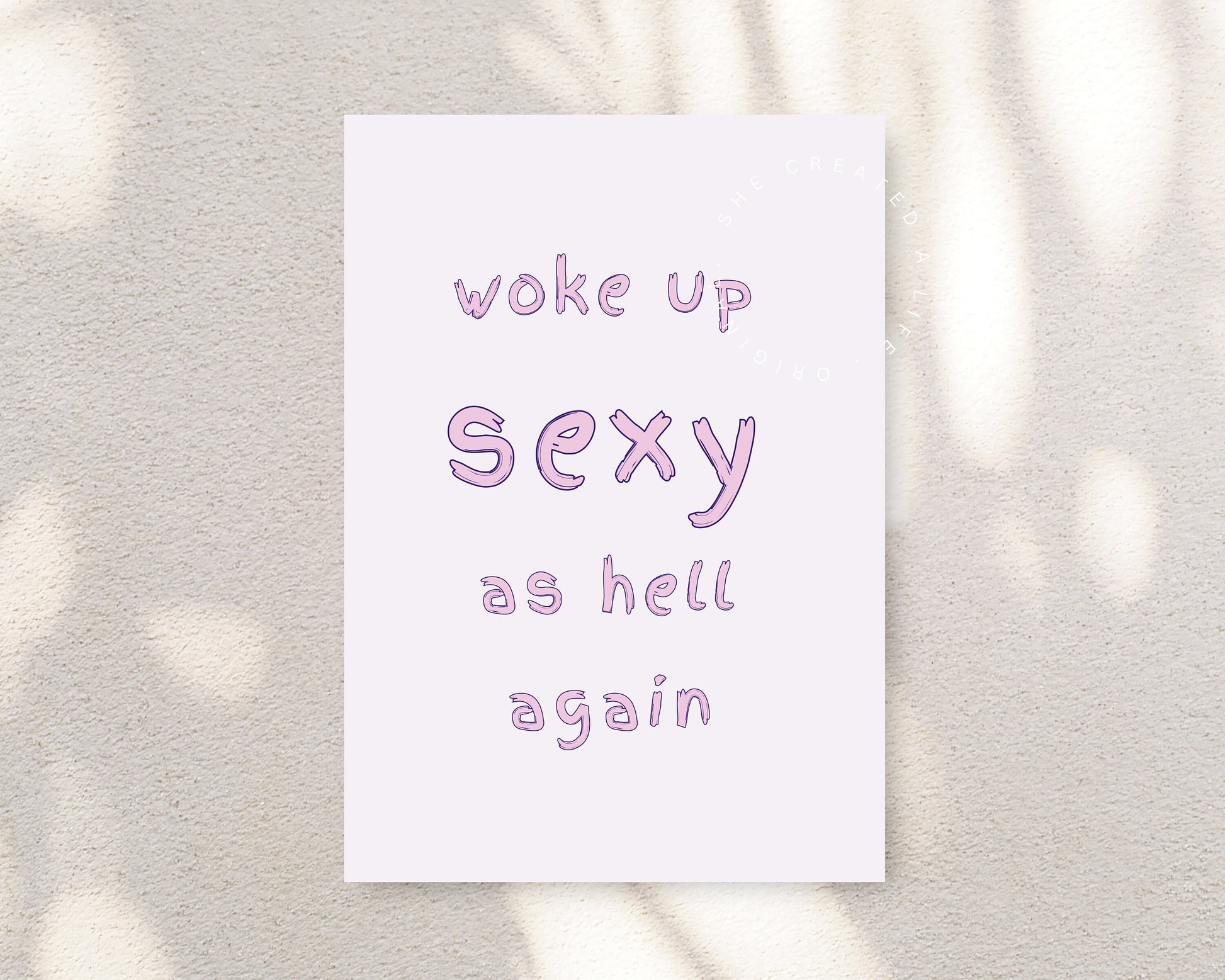 Woke Up Sexy As Hell Again. Amusing mantra in beautiful pink typography. A fun print , an image that will make you smile everyday, possibly a bit tongue in cheek, would look good hanging in a bathroom or bedroom, a poster to greet you when you wake up in the morning. An image you'd be happy to hang on your walls.